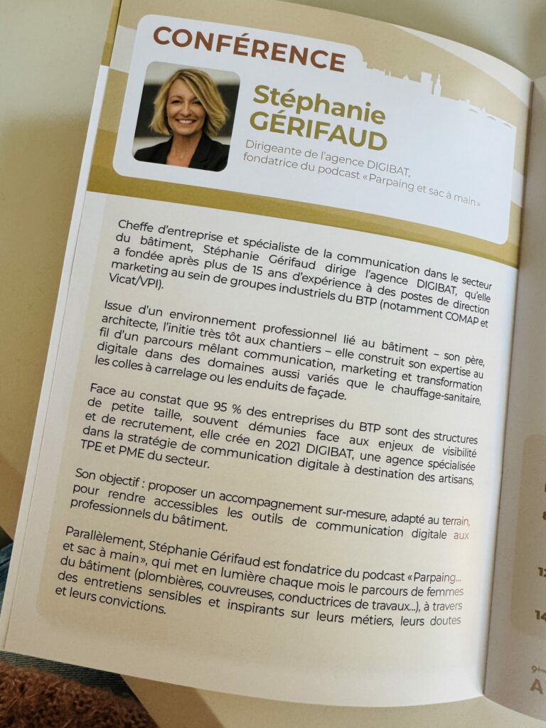 En octobre, Stéphanie Gerifaud, fondatrice de DIGIBAT et voix du podcast Parpaing et sac à main, a été invitée à intervenir sur un sujet qu’elle explore avec passion depuis presque 3 ans : la mixité dans le secteur du bâtiment.